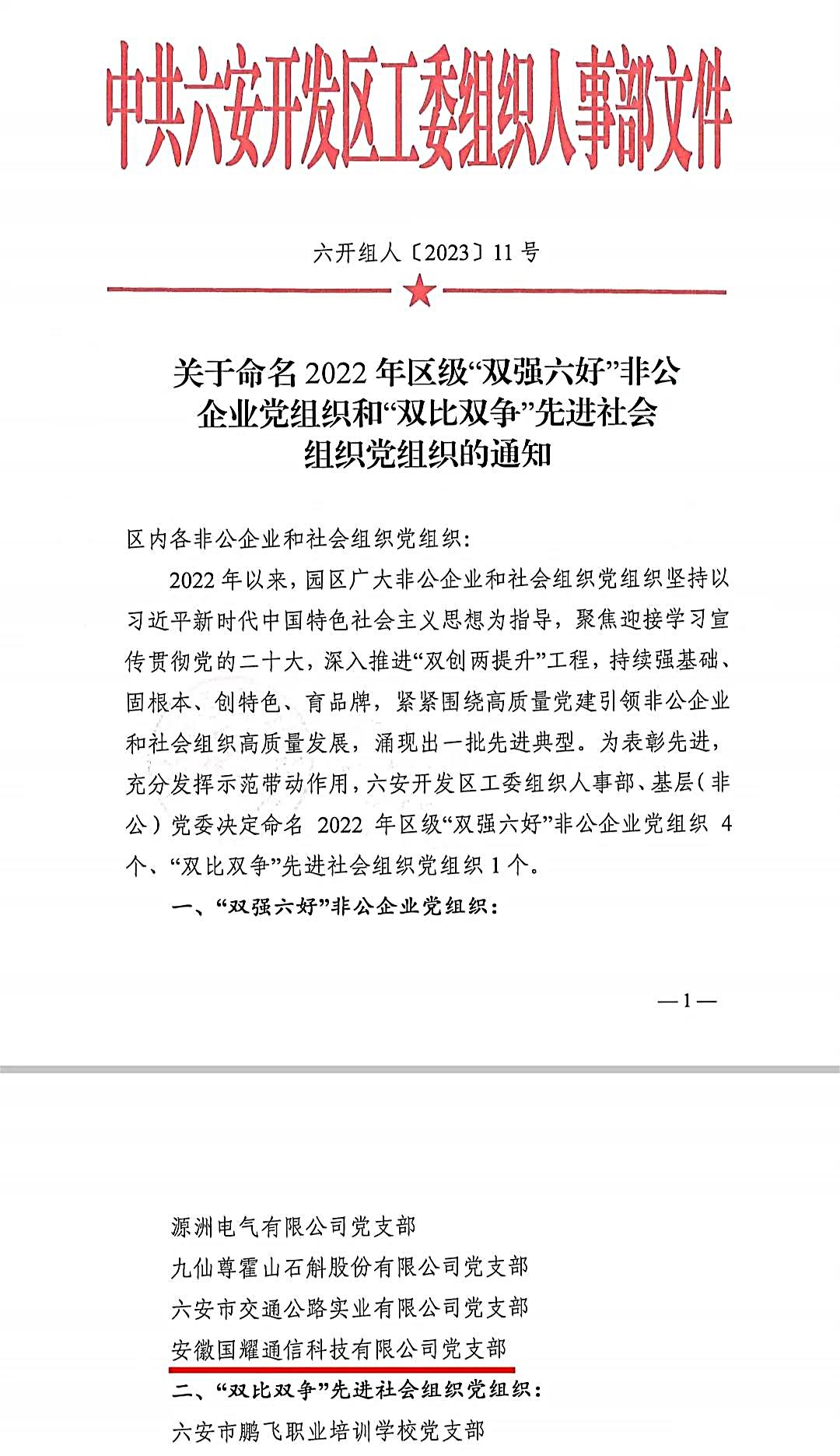 近日,中共六安開發(fā)區(qū)工委下發(fā)了《關(guān)于命名2022年區(qū)級“雙強(qiáng)六好”非公企業(yè)黨組織和“雙比雙爭”先進(jìn)社會組織黨組織的通知》,其中,安徽國耀通信科技有限公司黨支部獲評“‘雙強(qiáng)六好’非公企業(yè)黨組織”。
