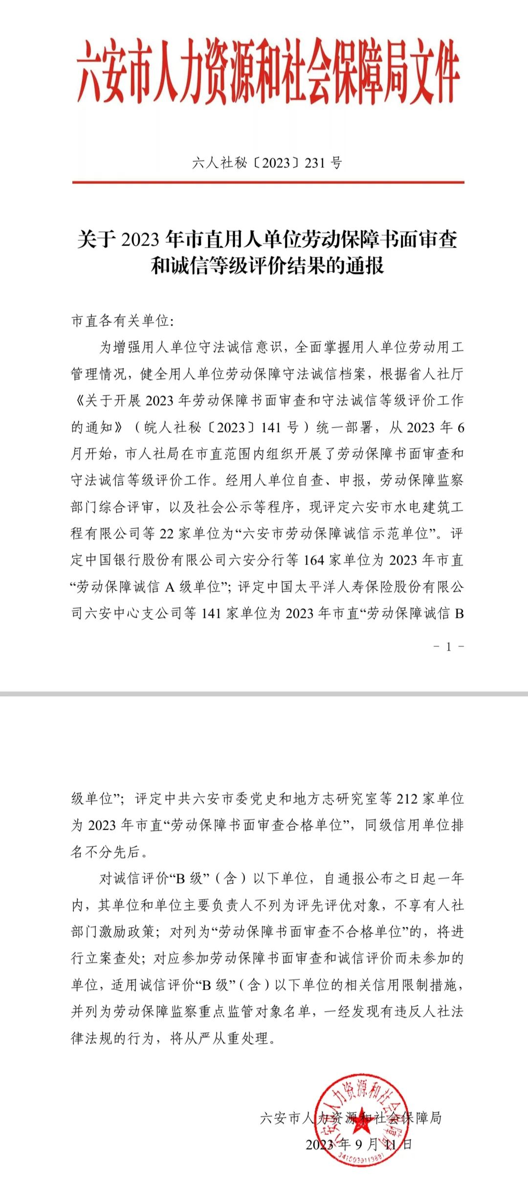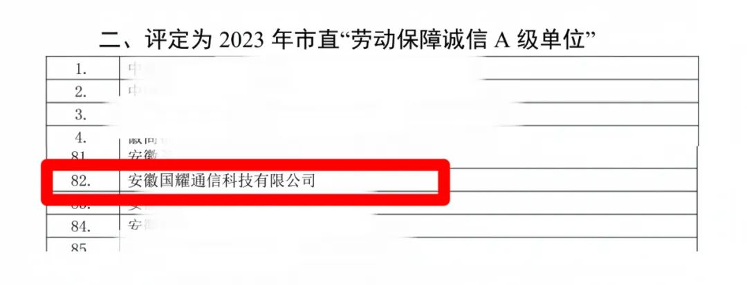 近日,六安市人力資源和社會保障局公布了用人單位勞動保障誠信守法等級評定結果,授予安徽國耀通信科技有限公司2023 年市直“勞動保障誠信 A 級單位”榮譽稱號。