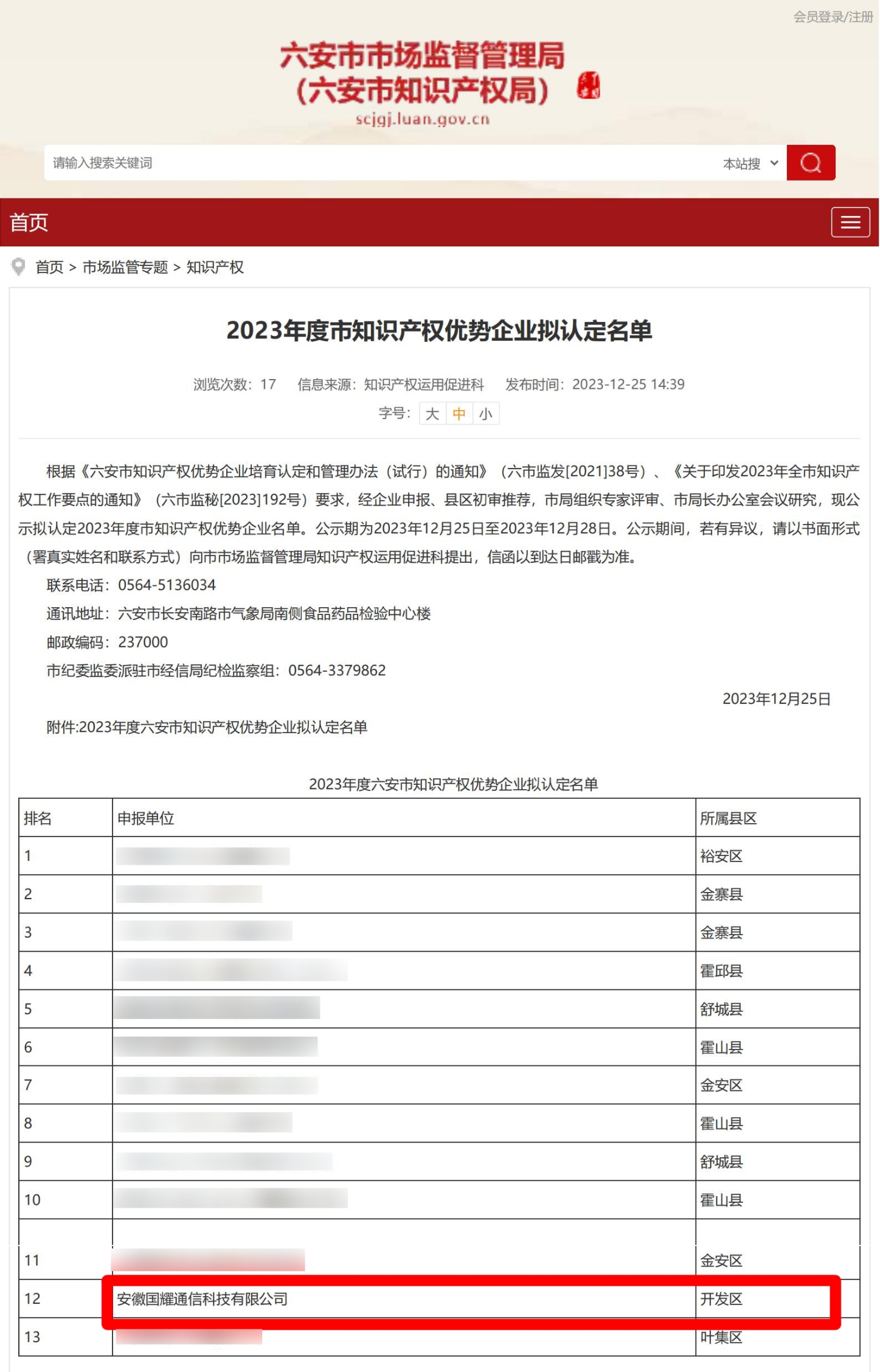 在創(chuàng)新的海洋中,我們揚帆前行,致力于推動科技進步和知識產權的保護。我司憑借持續(xù)的努力和卓越的創(chuàng)新成果,被六安市市場監(jiān)督管理局、六安市知識產權局認可,經過評比公示,授予我司2023年度“六安市知識產權優(yōu)勢企業(yè)”榮譽稱號!
