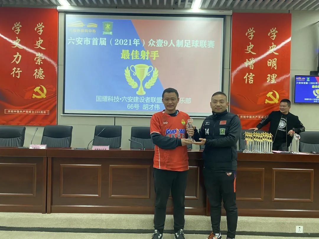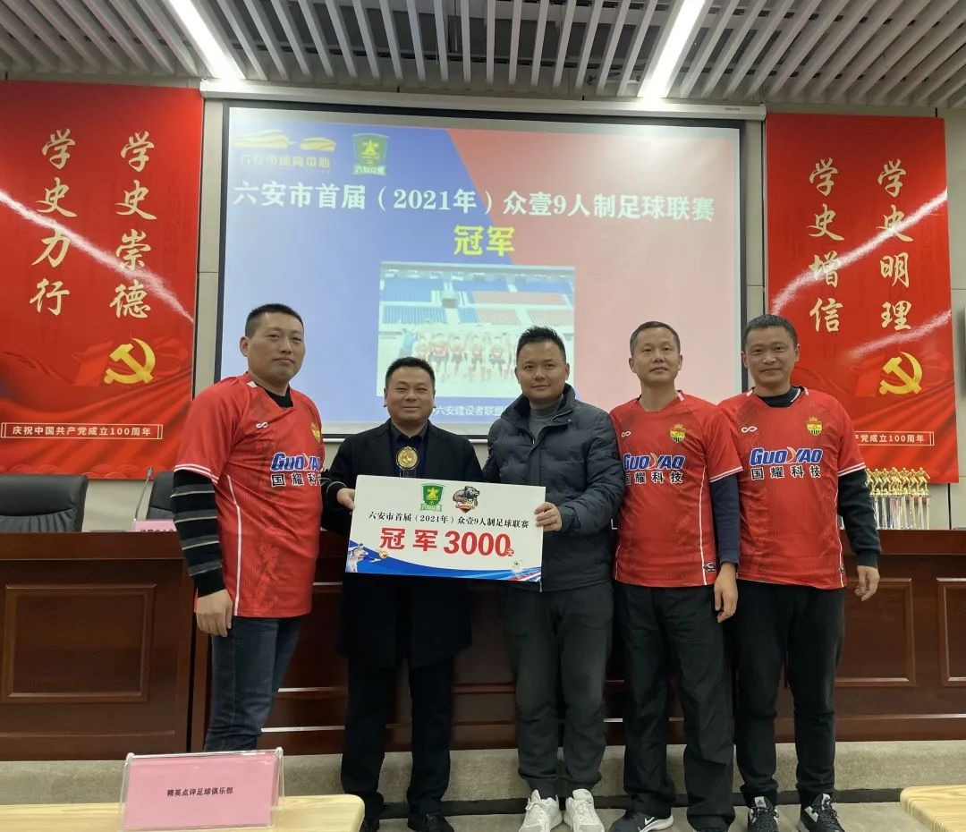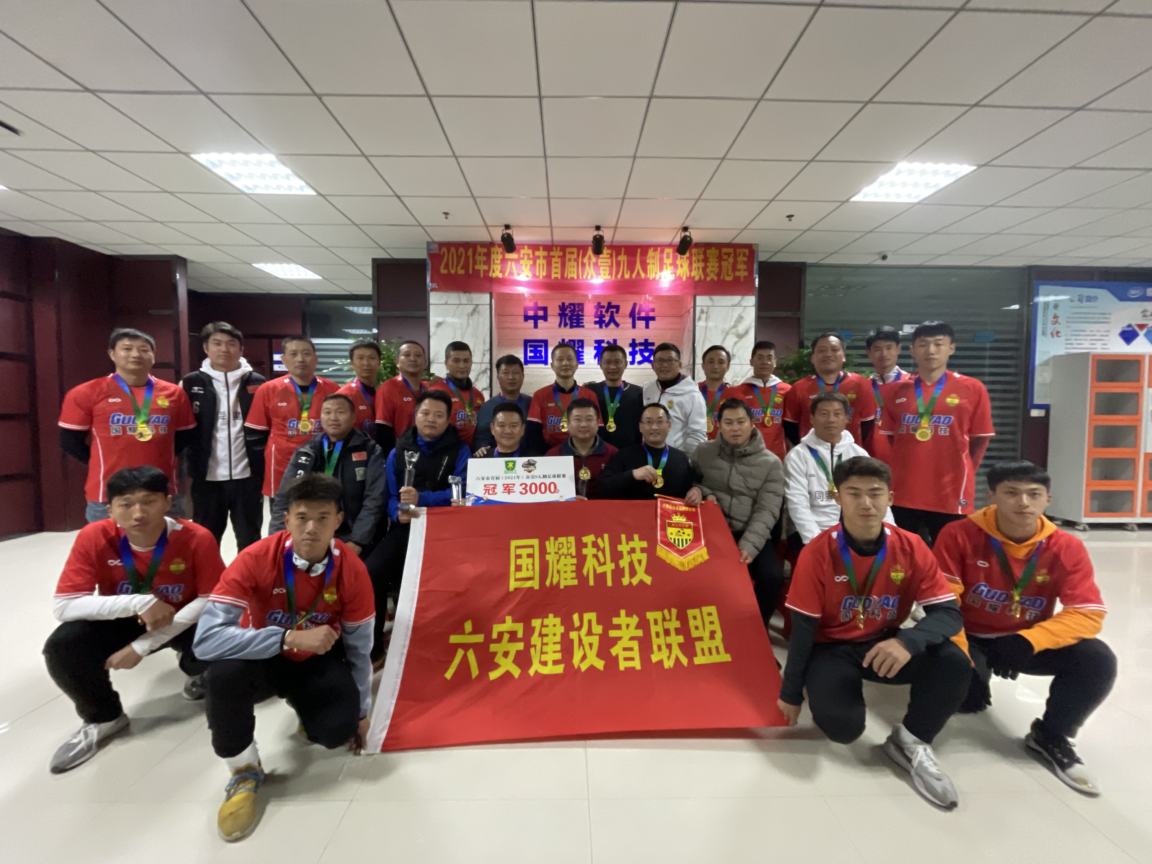 國(guó)耀科技六安建設(shè)者聯(lián)盟俱樂(lè)部在六安市首屆(2021年)眾壹9人制足球聯(lián)賽中斬獲冠軍,并包攬了最佳射手、最佳守門員等獎(jiǎng)項(xiàng)。安徽國(guó)耀通信科技有限公司特設(shè)慶功宴,與全體俱樂(lè)部成員共同分享歡樂(lè)時(shí)刻。